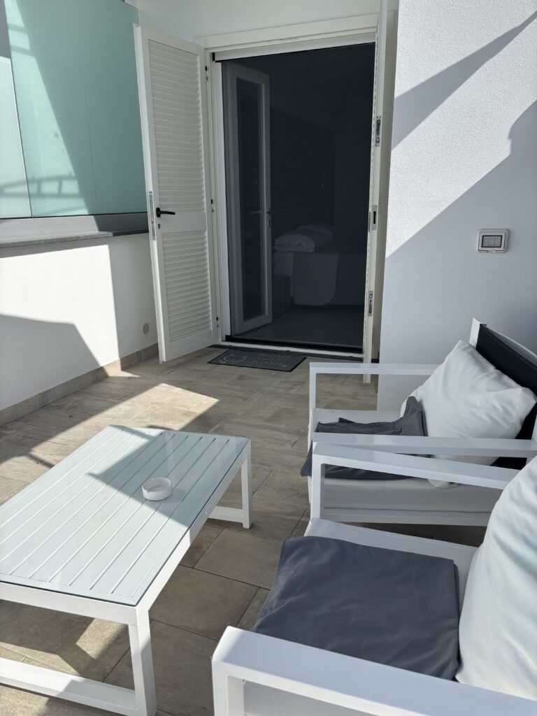 La proprietà ha un ampio terrazzo con giardino, doccia esterna, sedie prendisole, sedie e tavoli per godere della colazione o degli altri momenti della giornata ,come del tramonto.